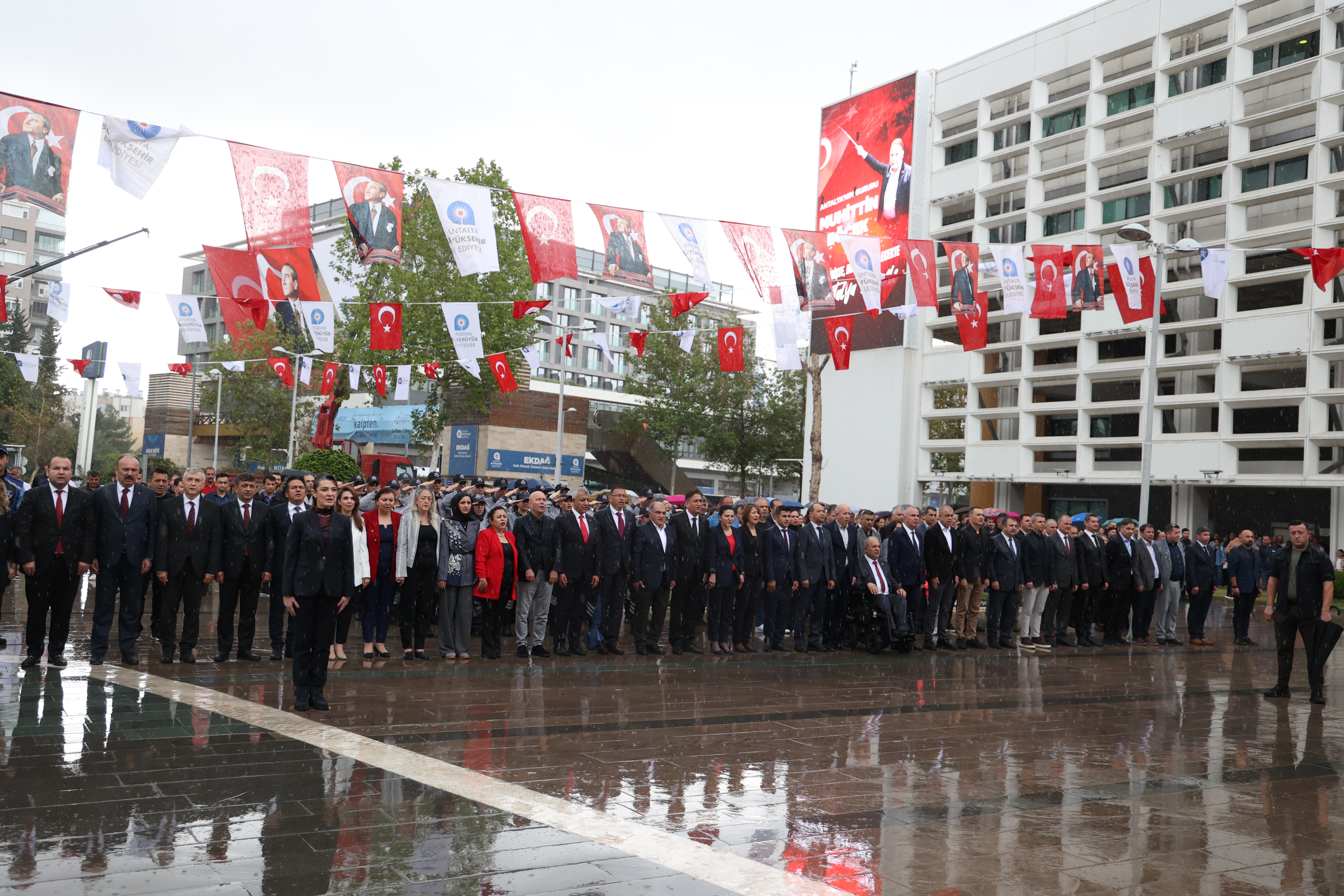Antalya Büyükşehir Belediyesi, Cumhuriyetimizin ilanının 102. yıl dönümü nedeniyle Büyükşehir Hizmet Binası önünde tören düzenledi.
